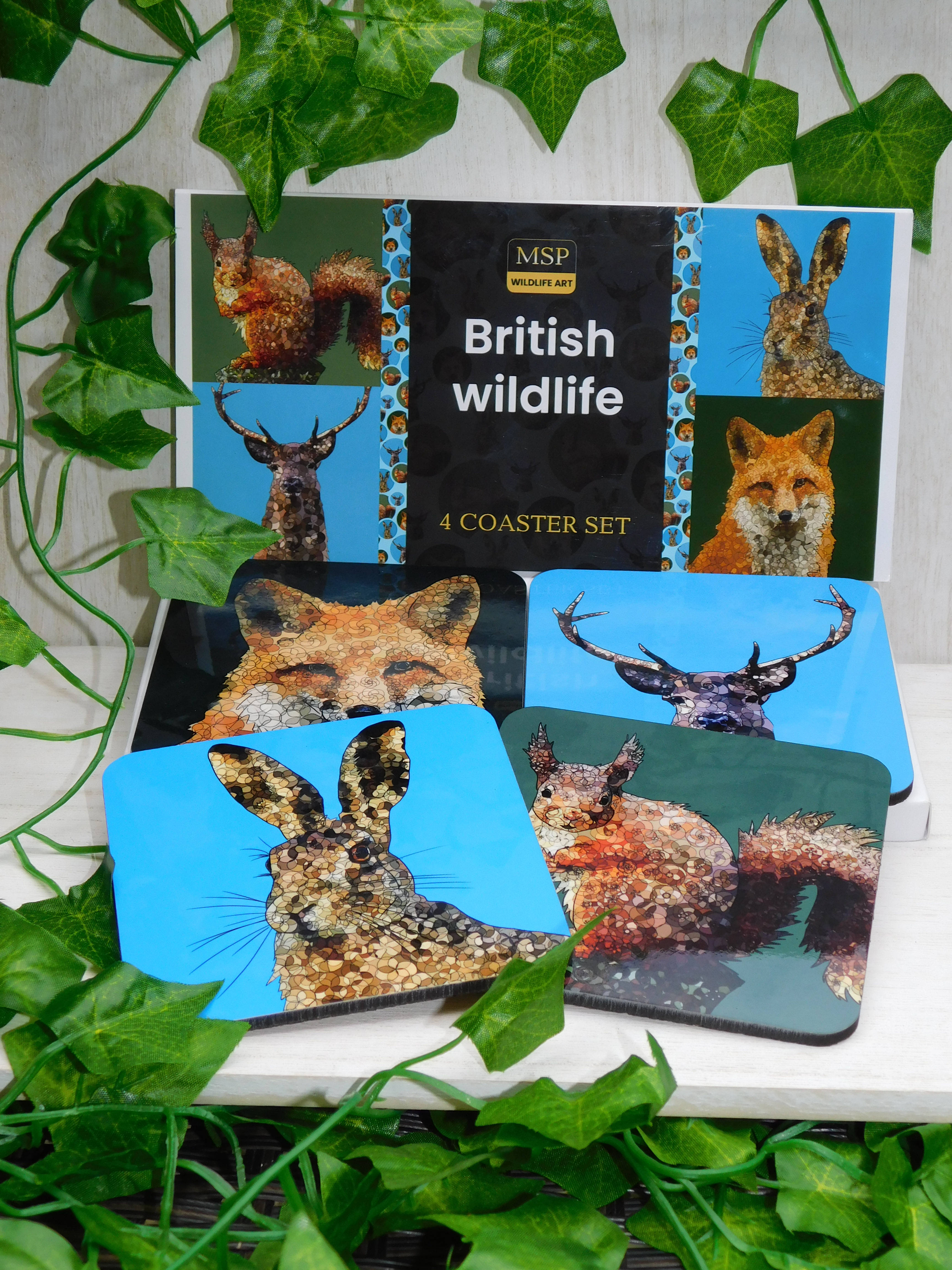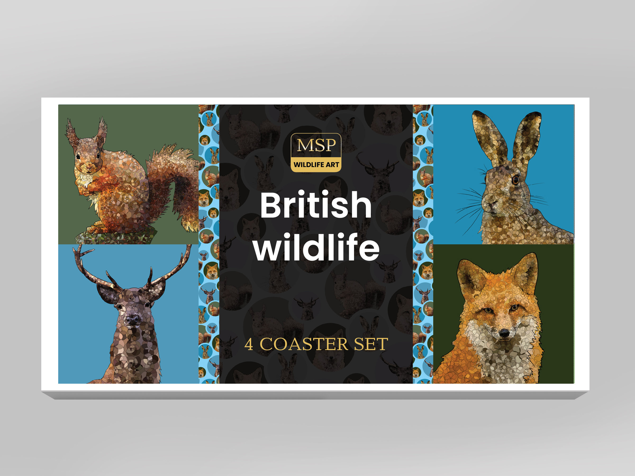 A set of 4 colourful coaster designs featuring four popular British wildlife species: red squirrel, brown hare, fox and red deer stag. You can also purchase these designs as single coasters in this category section.
